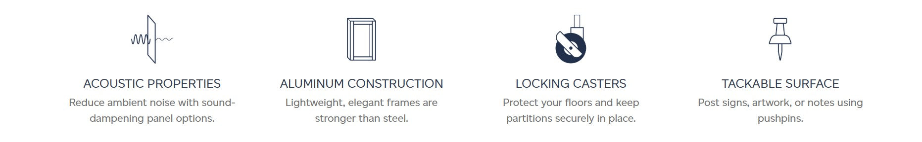 They're large enough to separate desk spaces or tables. Plus, they have a sound-dampening honeycomb cardboard core — NRC rating up to 0.77 — and tackable surface for posting signage or notes. Each Hush Screen includes a polycarbonate window — in three different options — for visibility and light. The dividers are easy to transport and can be assembled with wheel options or solid feet. Each unit ships with feet and wheels.
