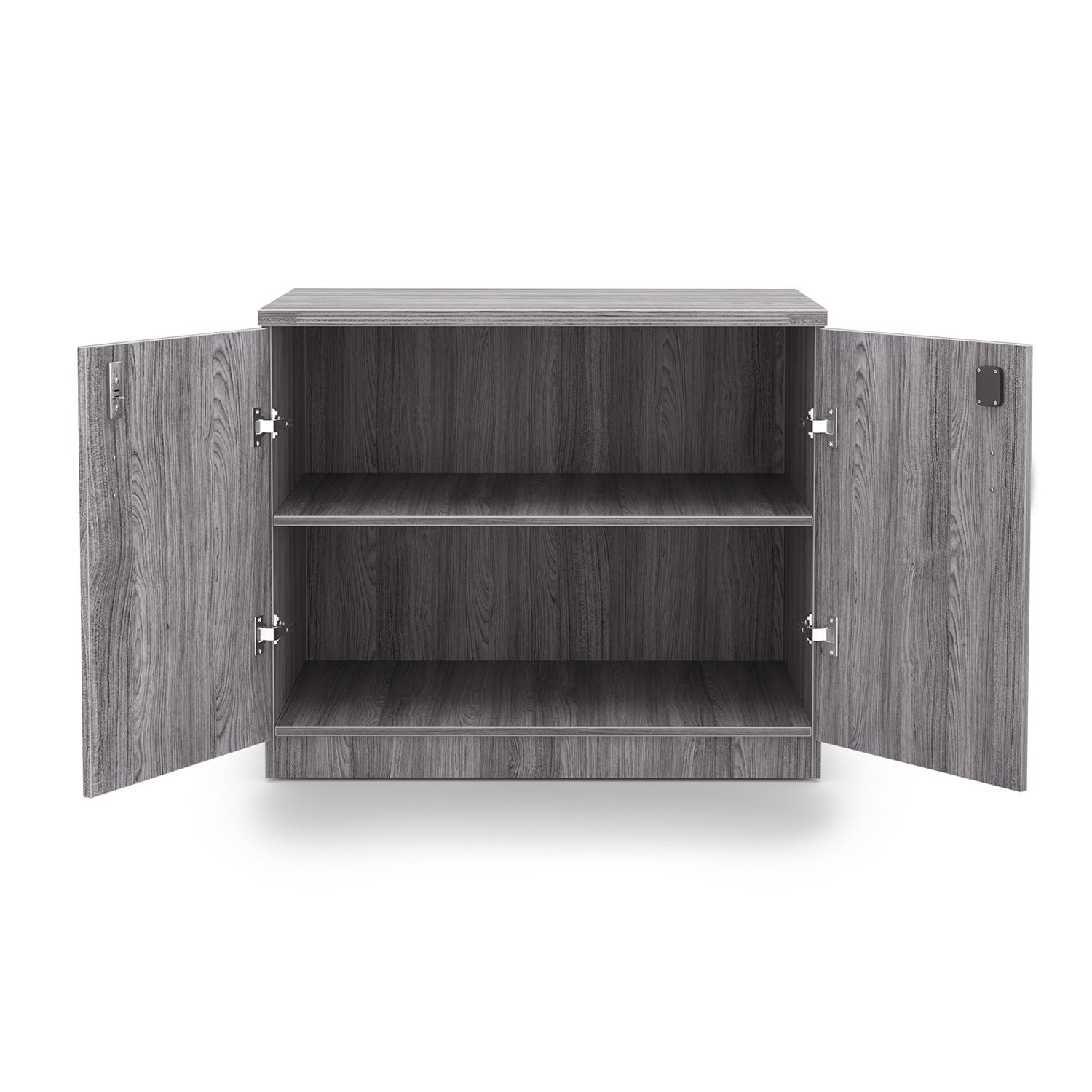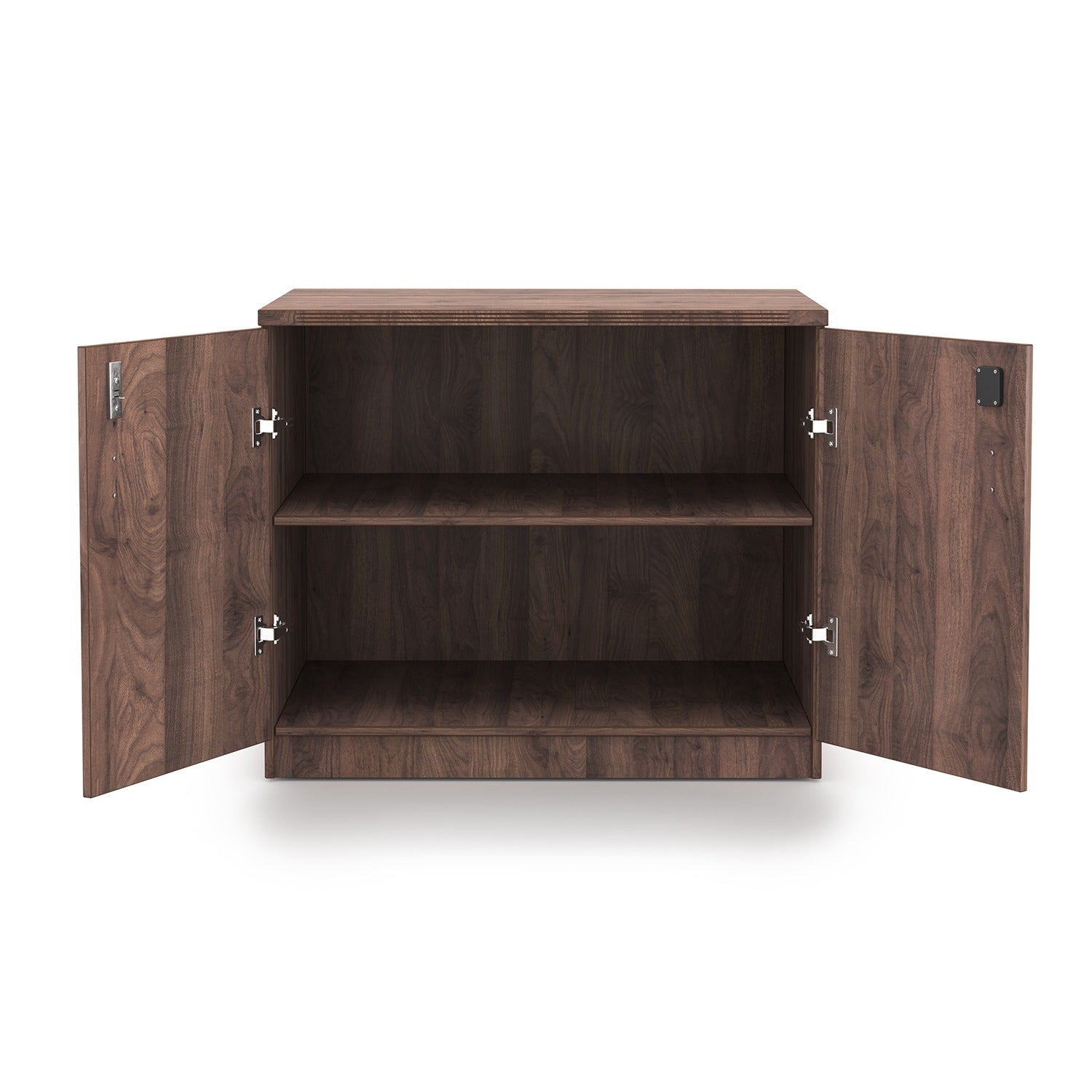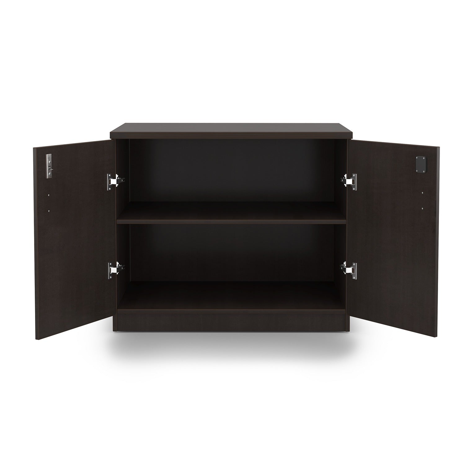 This laminate storage cabinet has two lockable doors and an adjustable shelf. Includes keyhole-shaped aluminum pulls. The top is fluted and all edges feature 3mm banding for a quality look and feel. Freestanding and perfect for both open-plan layouts or flush