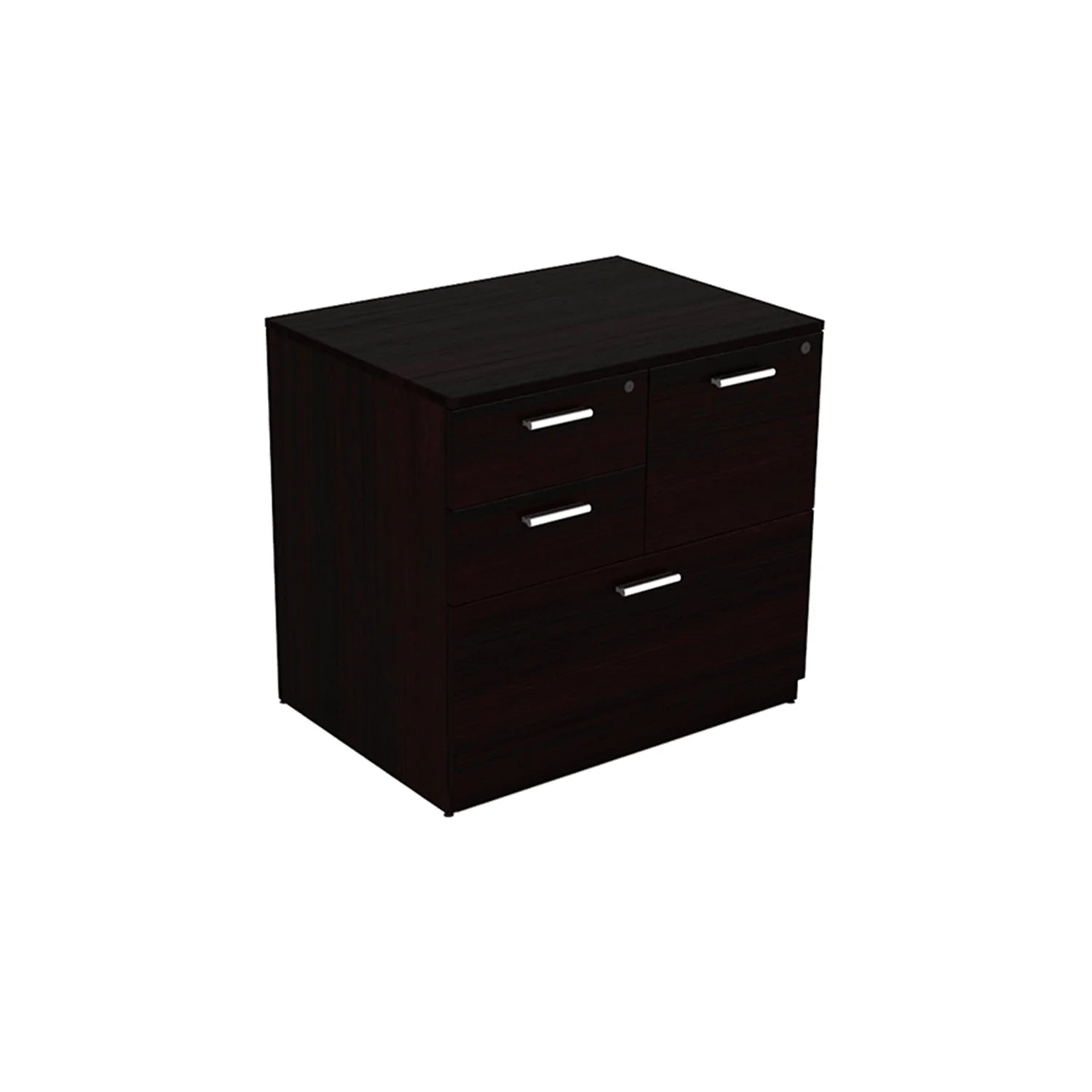 Laminate 4-Drawer Combination Lateral File. Includes two box/file drawers, a file/file drawer, and a lateral file. Offers a dual locking system with custom keying options is available. The top is fluted, all edges feature 3mm banding for a quality look and feel, and the drawers have keyhole-shaped aluminum pulls. Freestanding and perfect for both open-plan layouts or flush against a wall. Finished on all sides. Available in five finish options.