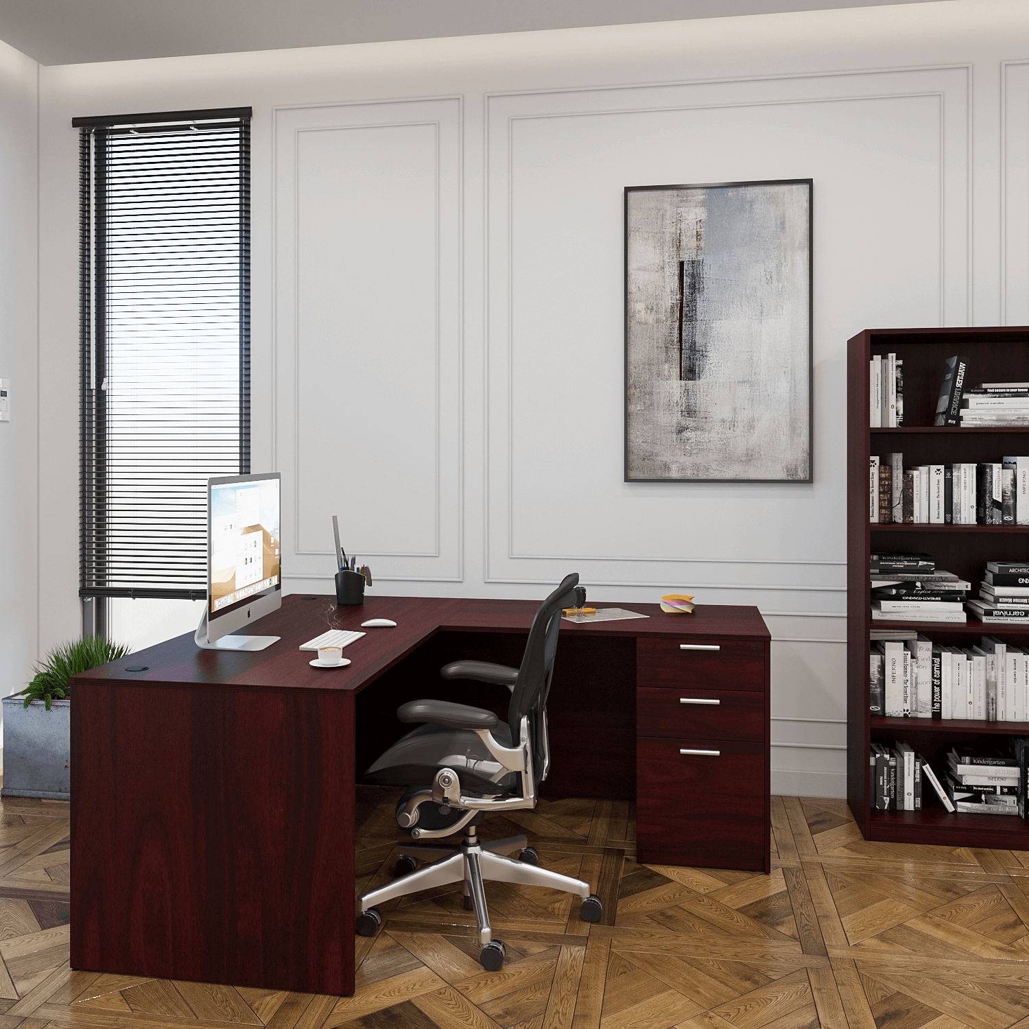 Reversible L-shaped desk with pedestal