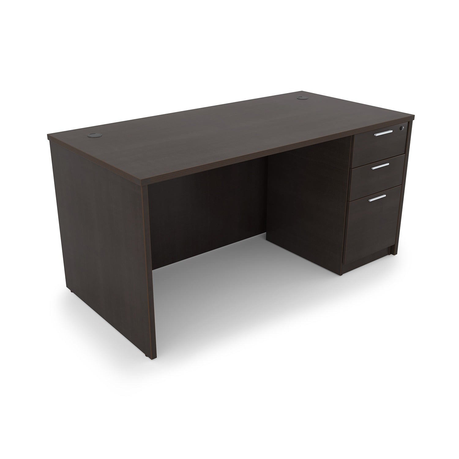 This standard-size desk features three drawers secured by a single lock and key that open and close on smooth metal runners. The lower file drawer has a removable hanging file bar for better organization. The size is ideal for executive offices, open plan office spaces, working from home, in an existing workstation - it fits in anywhere. This desk was built for durability with a heavy-duty cam and dowel system, it's been over-engineered with 15+ connection points. Available in five laminate finish options.
