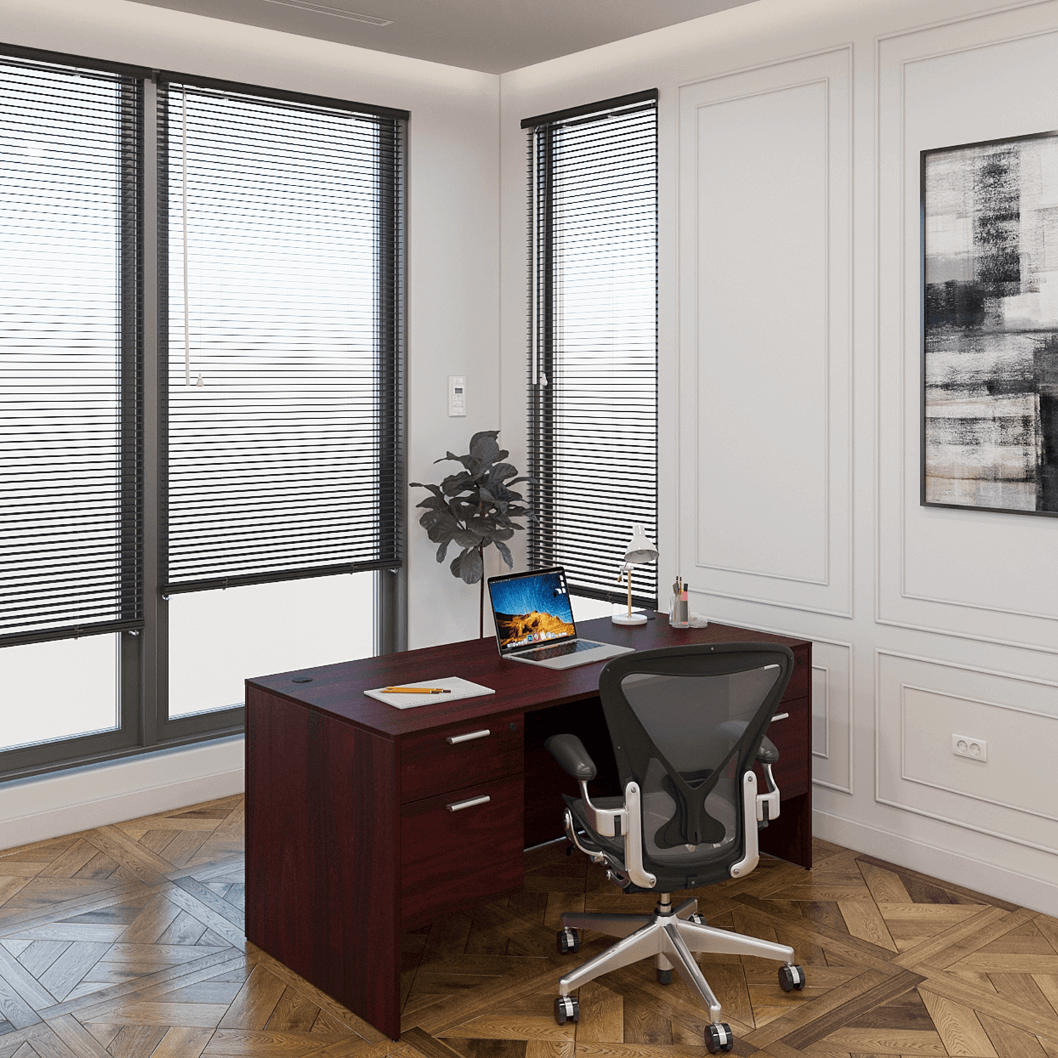 This four-drawer desk has a long surface area with storage to match and can fit up to three computer monitors comfortably. Featuring two drawers on one side and two on the other, each pedestal is secured by a single lock and key with drawers that open and close on smooth metal runners. The file drawers have a removable hanging file bar for better organization. This size is ideal for executive offices or spaces where surface area is important, and it was built for durability with a heavy-duty cam and dowel system.