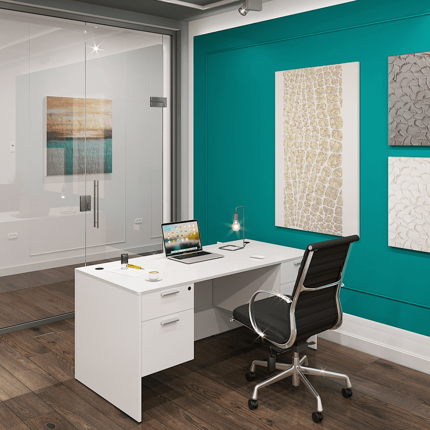 This four-drawer desk has a large surface area with storage to match and can fit up to three computer monitors comfortably. Featuring two drawers on one side and two on the other, each pedestal is secured by a single lock and key with drawers that open and close on smooth metal runners. The file drawers have a removable hanging file bar for better organization. This size is ideal for executive offices or spaces where surface area is important, and it was built for durability with a heavy-duty cam and dowel system.