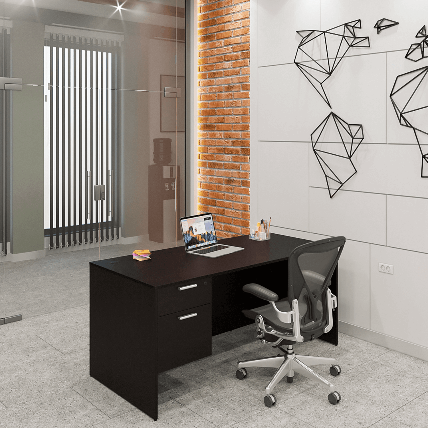 This two-drawer laminate desk will fit in anywhere with its contemporary design and commercial-quality construction. This standard-size desk features two drawers secured by a single lock and key that open and close on smooth metal runners. The lower file drawer has a removable hanging file bar for better organization. The size is ideal for executive offices or spaces where surface area is important. This desk was built for durability with a heavy-duty cam and dowel system, it's been over-engineered with 15+ connection points. Available in five laminate finish options.