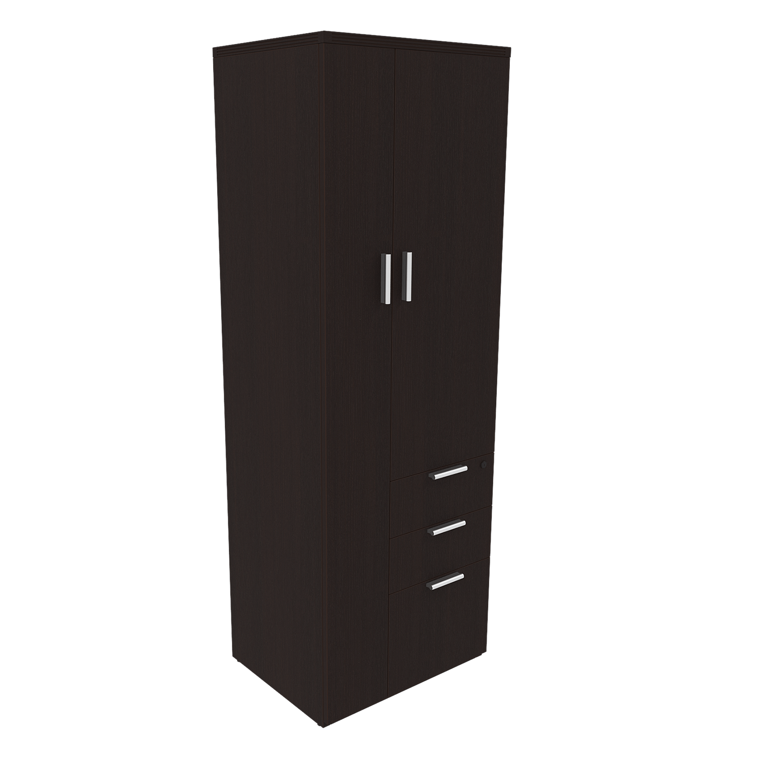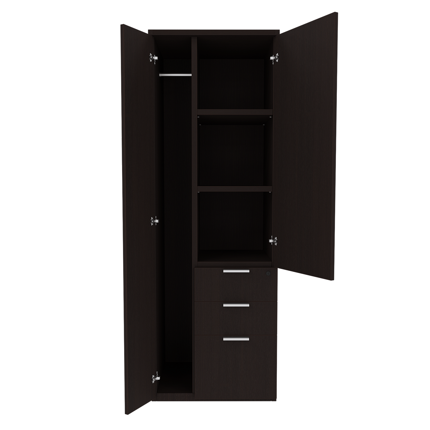 Classic two door wardrobe with a built-in box/box/file pedestal for even more storage potential. Hang your coat up on the rack and utilize any of the three shelves for clothing or item storage. Includes keyhole-shaped aluminum pulls and a lock that secures the